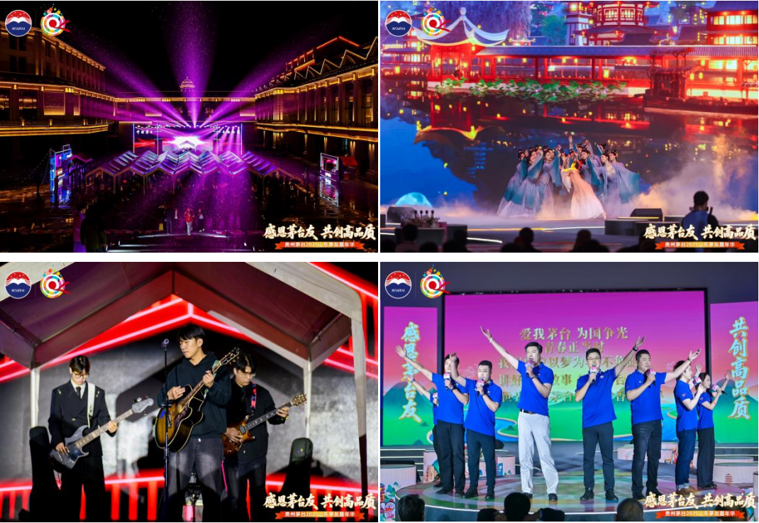夜幕輕垂,茅友之夜如約啟幕?!懊┯鸭已纭迸c“微醺之夜”兩個(gè)篇章層層遞進(jìn),讓每一位茅友在舉杯共敬間,真情交流,切實(shí)感受到這份相聚里的感恩暖意與未來(lái)期許?!懊┯鸭已纭逼?,開(kāi)場(chǎng)舞劇《清照詞箋·永遇樂(lè )》深度結合明水古城清照文化,借虛實(shí)交織的舞臺設計,再現宋代文人雅集賞燈的盛景和“染柳煙濃”的詩(shī)意;山東茅臺傳承人攜手唱響AI定制歌曲《友朋自遠方來(lái)》,歡快的旋律、熱情的唱腔,既唱出茅臺的酒韻芬芳,更寄托著(zhù)“四海茅友是一家”的美好愿景;特色樂(lè )器演奏流淌心弦,一曲曲明月相伴的雅韻悠長(cháng),串聯(lián)起知己相逢的暖意,映照著(zhù)與茅臺共度的歲月靜好?!拔Ⅴ钢埂逼?,經(jīng)典歌曲唱響歲月情懷、搖滾派對點(diǎn)燃熱烈氛圍、微醺民謠傳遞溫柔情愫……茅友們在愉悅的視聽(tīng)享受中品鑒茅臺之美,感受身心放松的愜意。當旋律漸入尾聲,大家紛紛舉起熒光棒,在璀璨光影與歡樂(lè )氛圍中,為這場(chǎng)相聚暫畫(huà)上圓滿(mǎn)句點(diǎn)。
